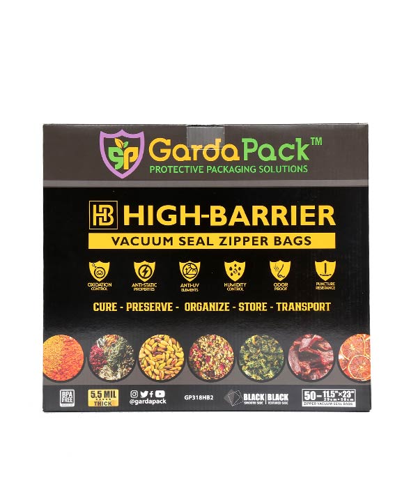 Our GardaPack® High-Barrier Pro 11.5″x23″ All-Black Double Zipper Vacuum Seal Bags offer the highest level of preservation for your sensitive products, now with the maximum convenience of a double zipper for easy and frequent access to contents. This advanced film is engineered with the lowest OTR and WVTR on the market, combined with Superior Puncture-Resistance, Anti-UV Elements, and Static-Resistance Properties. This ensures even the most sensitive perishables remain as fresh as possible until you’re ready to use them.