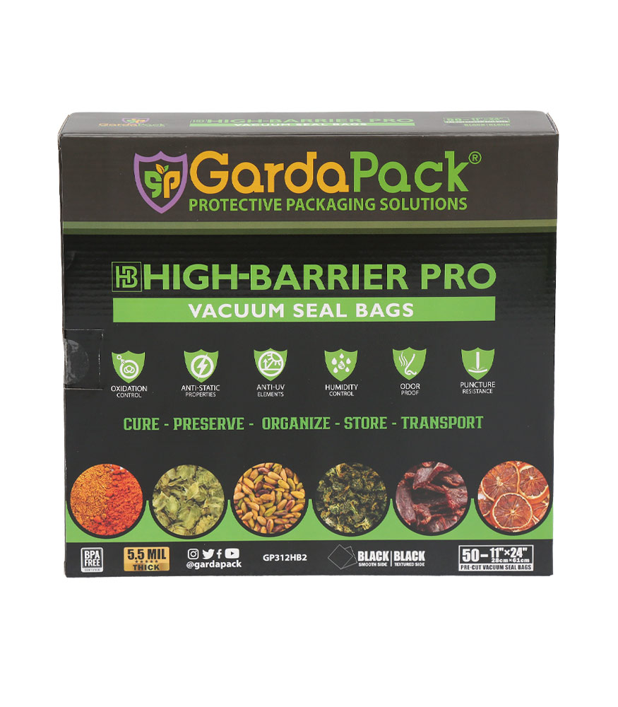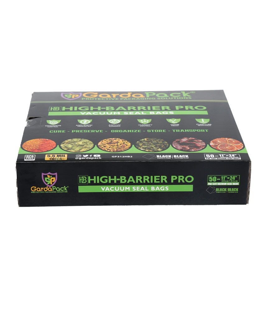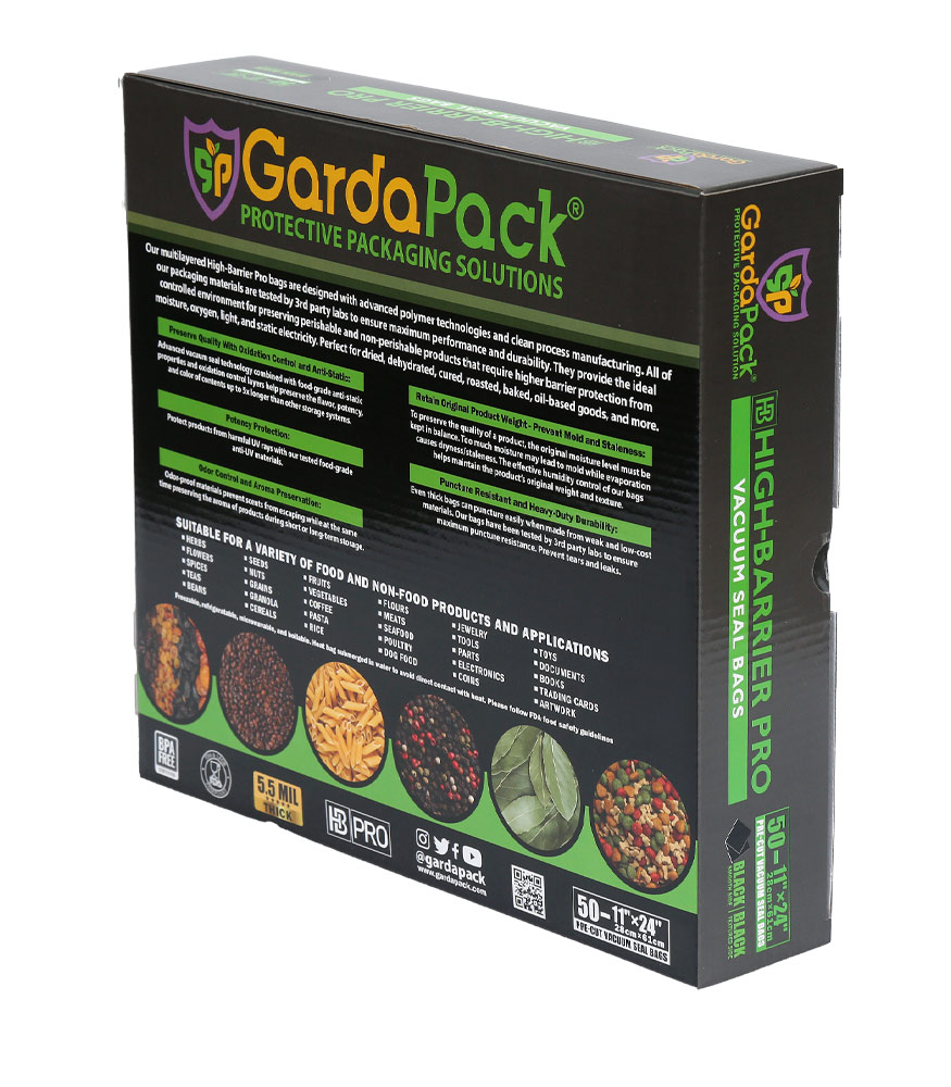 Our GardaPack® High-Barrier Pro 11″x24″ All-Black Pre-cut Vacuum Seal Bags offer the highest level of preservation for your sensitive products with maximum convenience. This advanced film is engineered with the lowest OTR and WVTR on the market, combined with Superior Puncture-Resistance, Anti-UV Elements, and Static-Resistance Properties. This ensures even the most sensitive perishables remain as fresh as possible until you’re ready to use them.