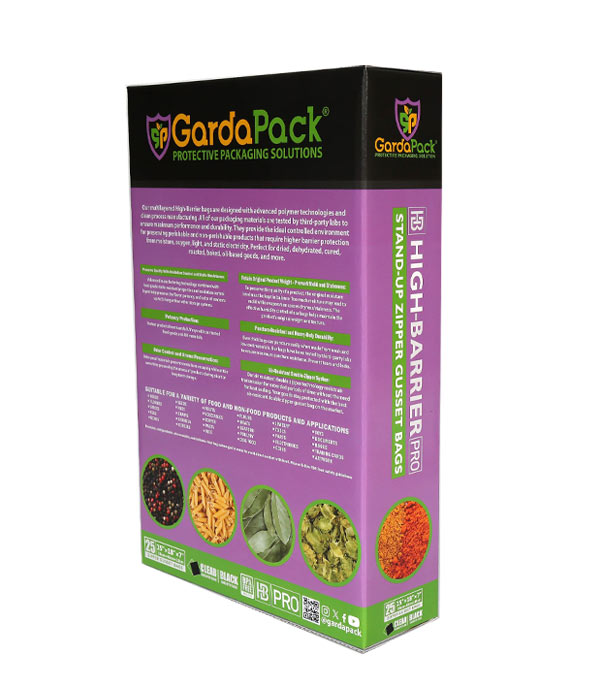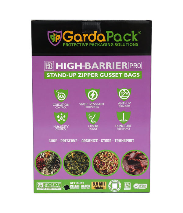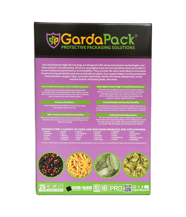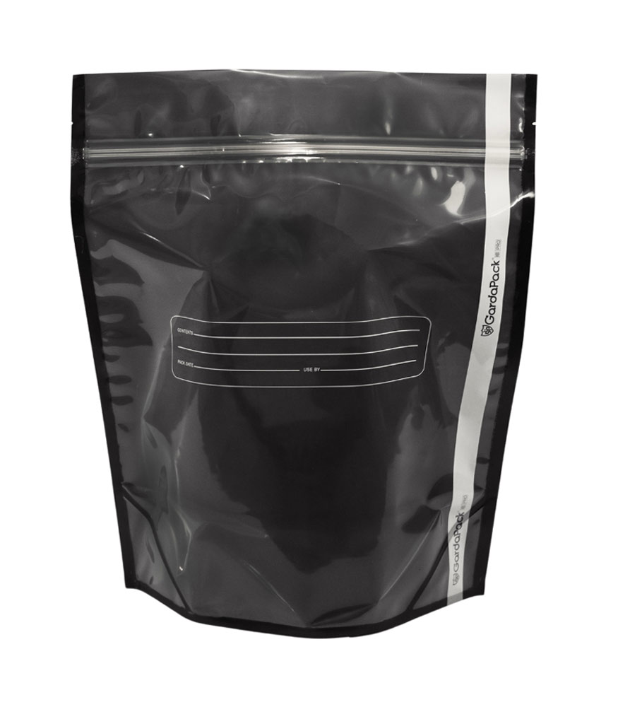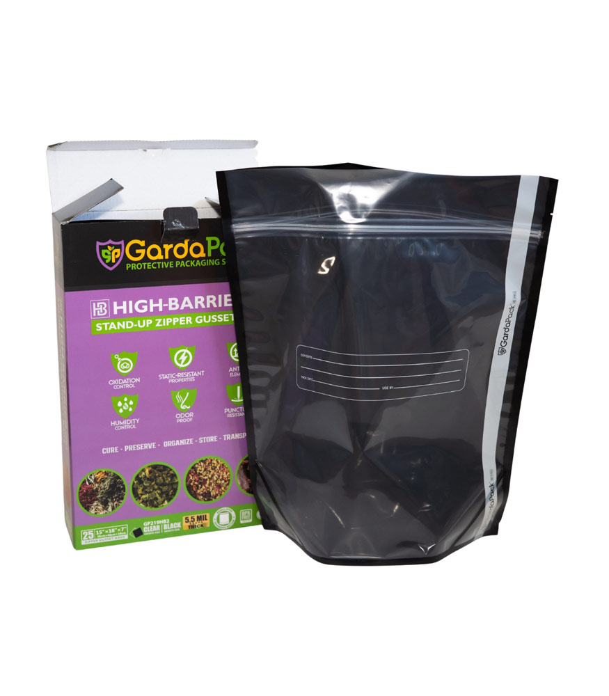 Our GardaPack® High-Barrier Pro Stand-up Clear and Black Double Zipper Gusseted Bags represent the pinnacle of product preservation combined with superior user convenience. This unique design is the ideal storage solution for bulk items requiring frequent access without compromising the re-seal integrity. The stand-up gusset makes filling simple, keeps contents stable, and accommodates irregular shapes with ease.