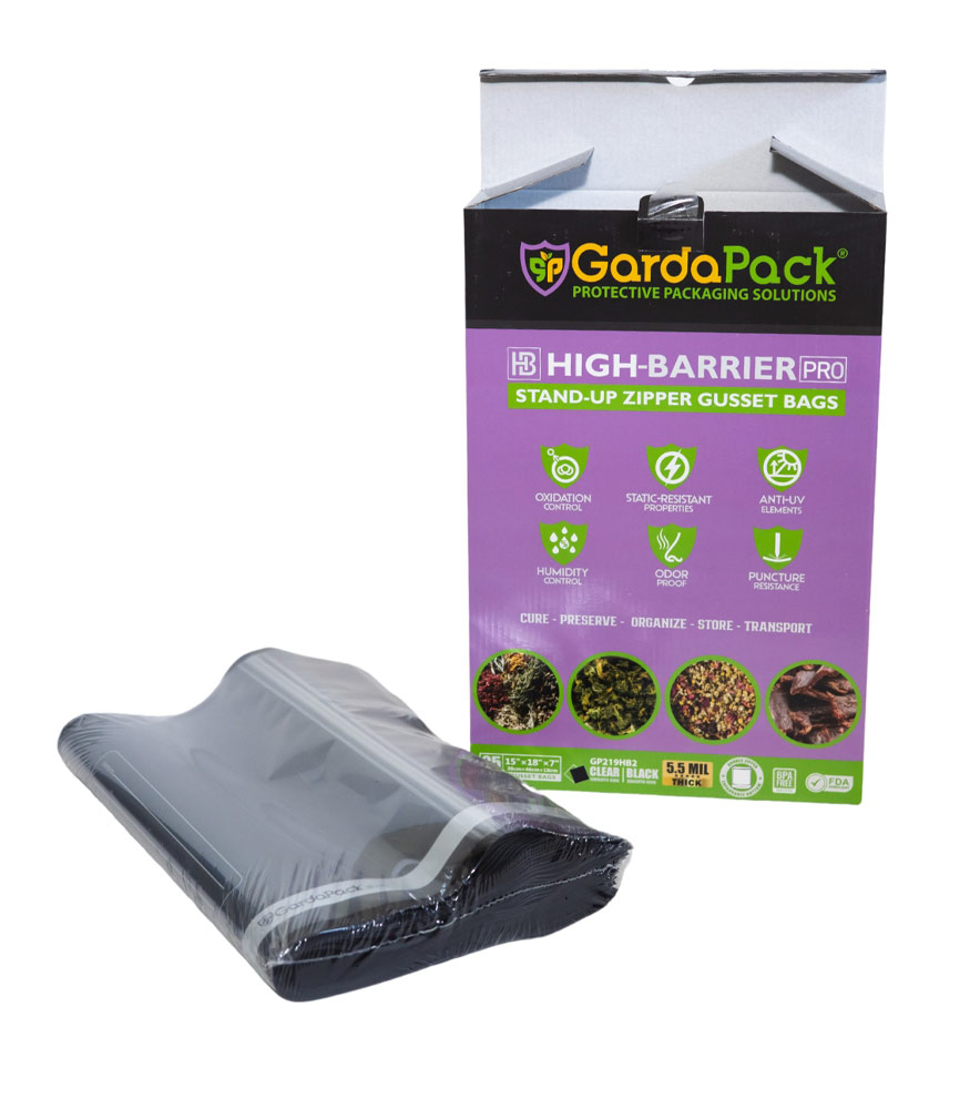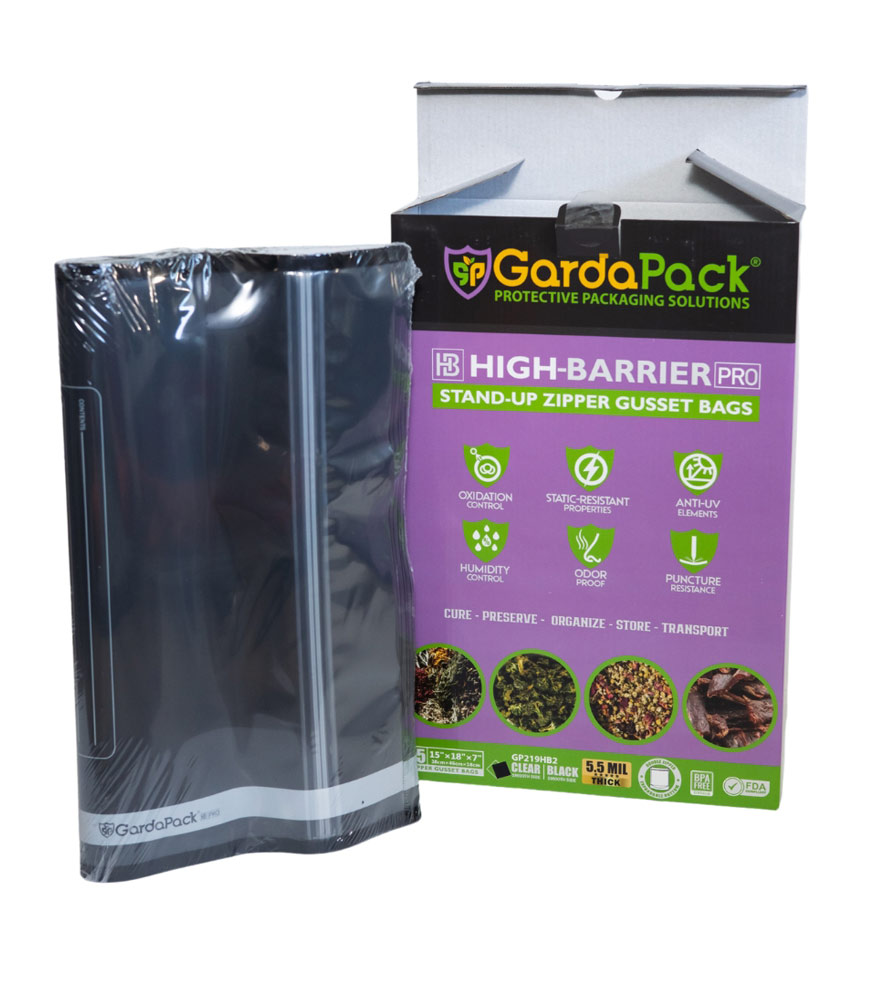 Our 5.5-Mil High-Barrier Pro Line Film (GP55HB2) is the proven result of rigorous third-party laboratory testing, engineered to deliver the ultimate protection for oxygen and moisture-sensitive products. Unlike embossed (textured) storage films, our material features a flat, smooth surface on both sides. This superior construction maximizes material density and film integrity, resulting not only in the absolute lowest OTR and WVTR scores on the market, but also providing the highest degree of puncture resistance by eliminating weak points inherent in textured films. The multiple layers of polymer materials create an impermeable barrier against oxygen, odor, moisture, UV light, and contaminants, effectively maintaining your product’s quality.