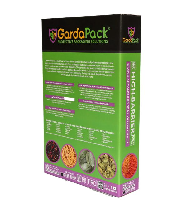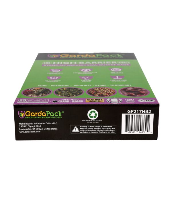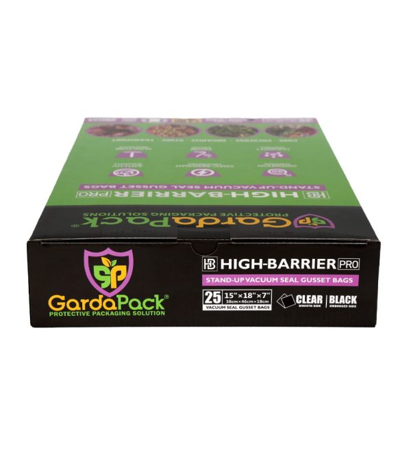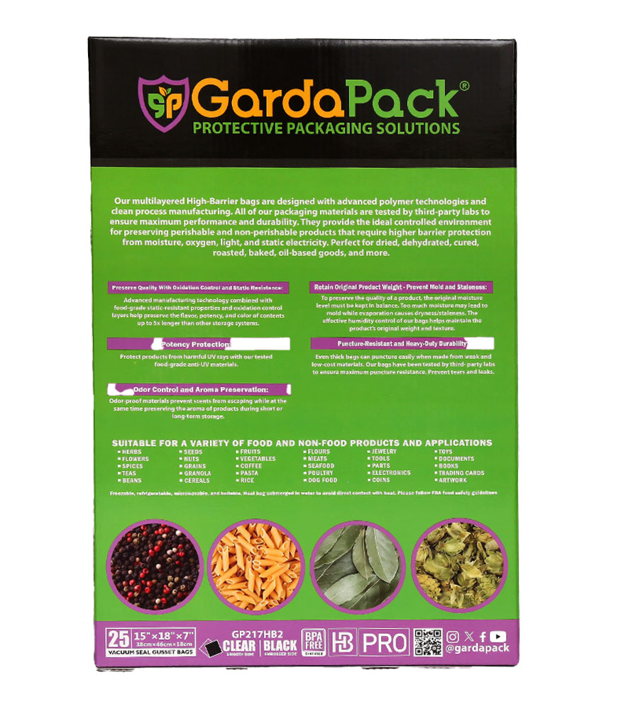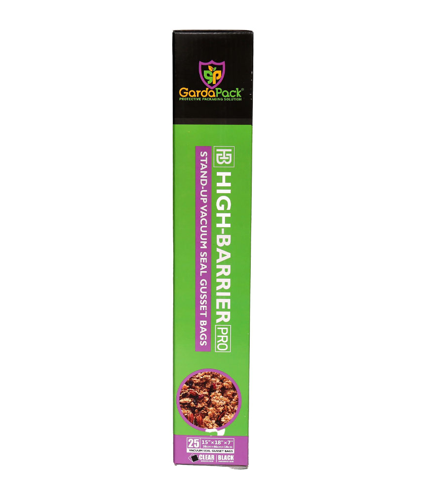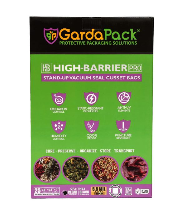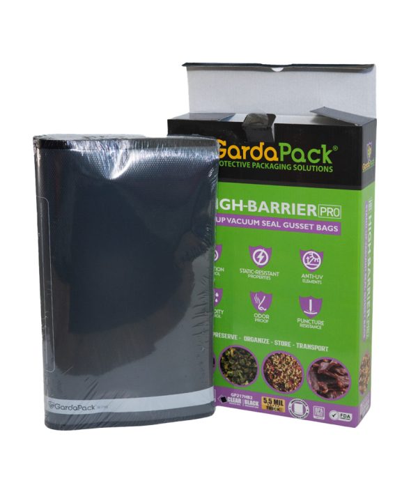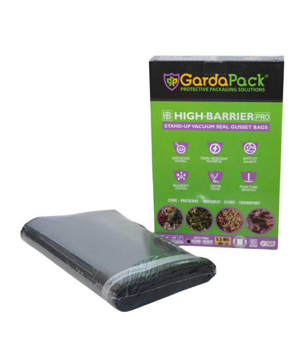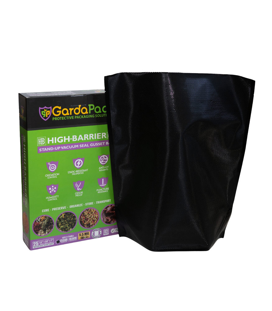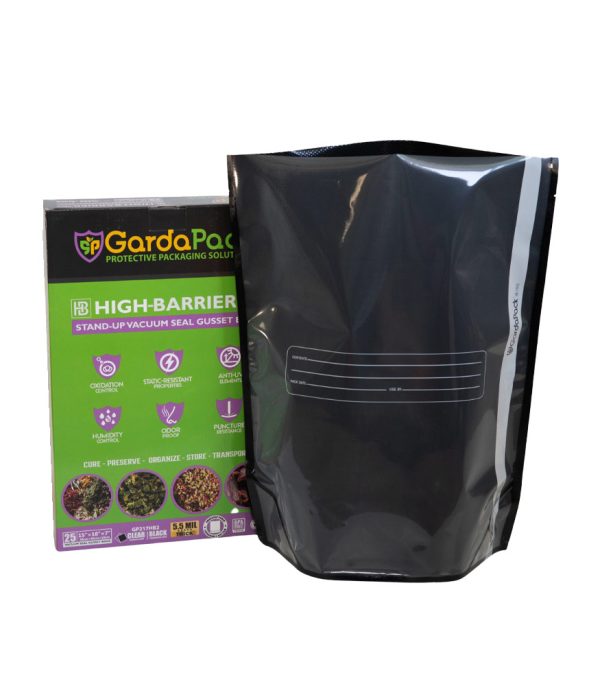 Our GardaPack® High-Barrier Pro Clear and Black Stand-up Gusseted Vacuum Seal Bags offer the highest level of preservation for your sensitive products with the convenience of an easy-to-fill opening and an expandable gusset to accommodate bulk and irregularly sized products. This advanced film is engineered with the lowest OTR and WVTR on the market, combined with Superior Puncture-Resistance, Anti-UV Elements, and Static-Resistance Properties. This ensures even the most sensitive perishables remain as fresh as possible until you’re ready to use them.
