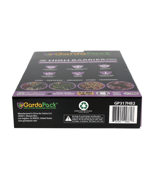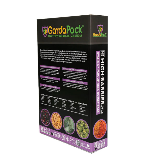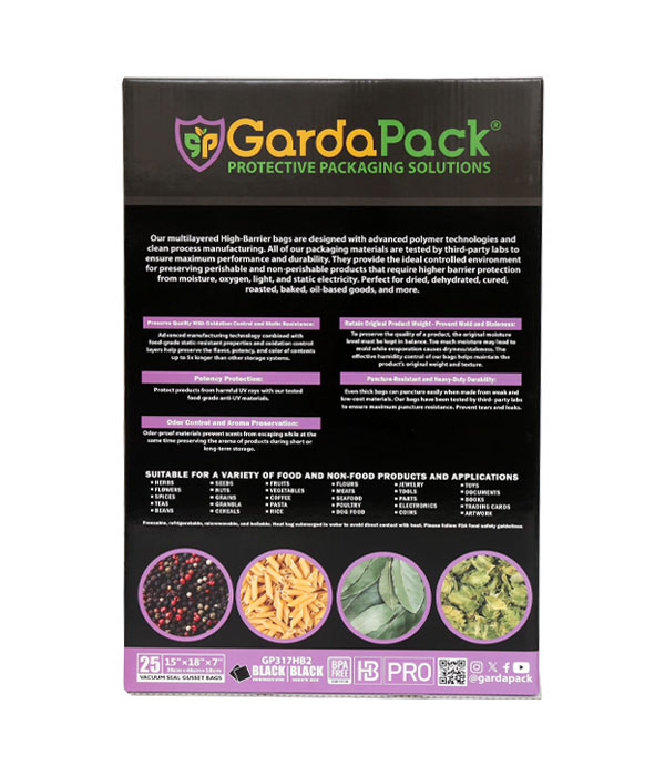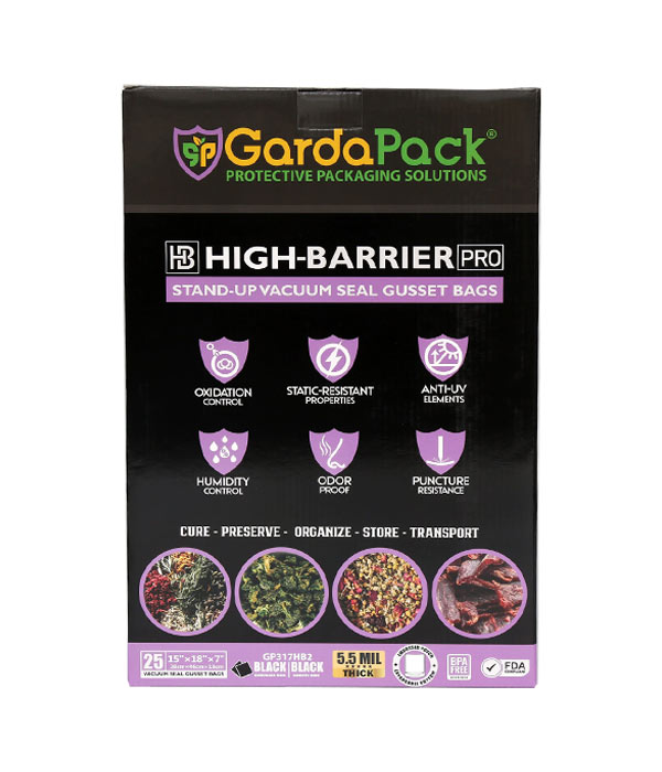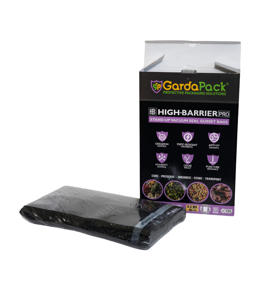 Our GardaPack® High-Barrier Pro All-Black Stand-up Gusseted Vacuum Seal Bags offer the highest level of preservation for your sensitive products with the convenience of an easy-to-fill opening and an expandable gusset to accommodate bulk and irregularly sized products. This advanced film is engineered with the lowest OTR and WVTR on the market, combined with Superior Puncture-Resistance, Anti-UV Elements, and Static-Resistance Properties. This ensures even the most sensitive perishables remain as fresh as possible until you’re ready to use them.