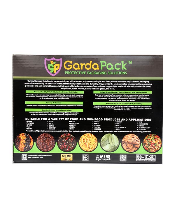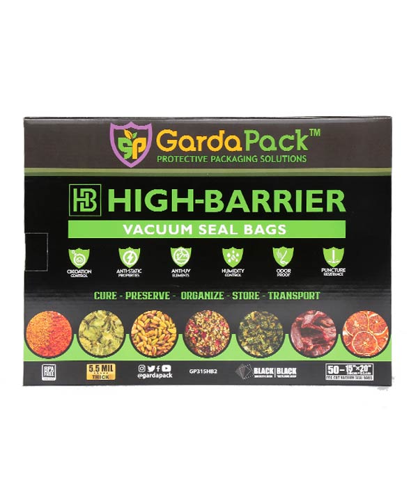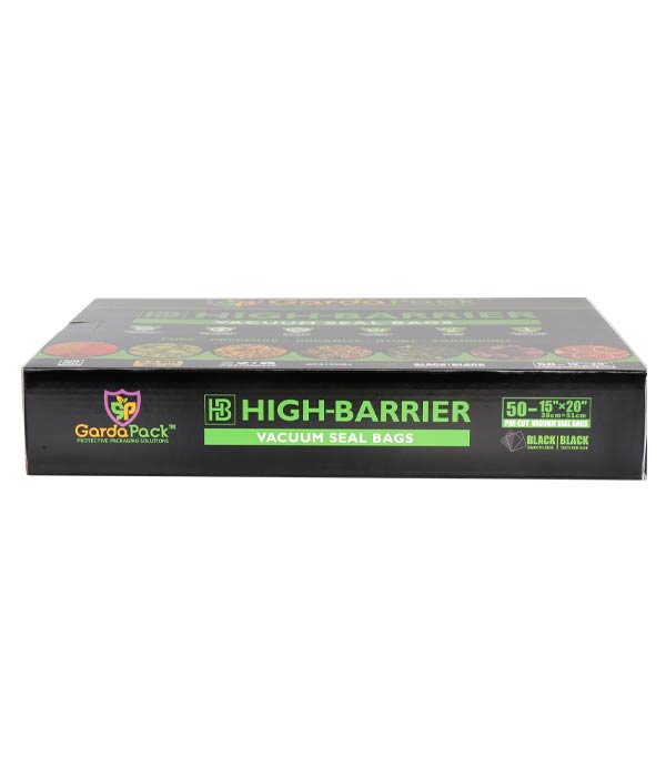 Our GardaPack® High-Barrier Pro 15″x20″ Pre-cut All-Black Vacuum Seal Bags offer the highest level of preservation for your sensitive products with maximum convenience. This advanced film is engineered with the lowest OTR and WVTR on the market, combined with Superior Puncture-Resistance, Anti-UV Elements, and Static-Resistance Properties. This ensures even the most sensitive perishables remain as fresh as possible until you’re ready to use them.